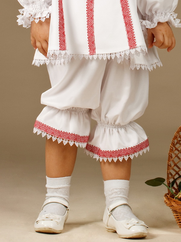 Штани вишиті для дівчинки - український народний одяг - модель Ш 4-11. Тканина сорочкова біла. Вишивка червоного кольору, ткана з акрилових ниток.