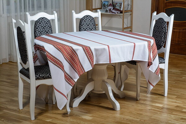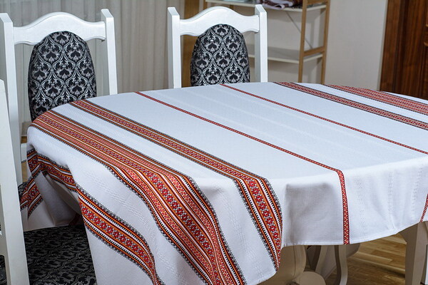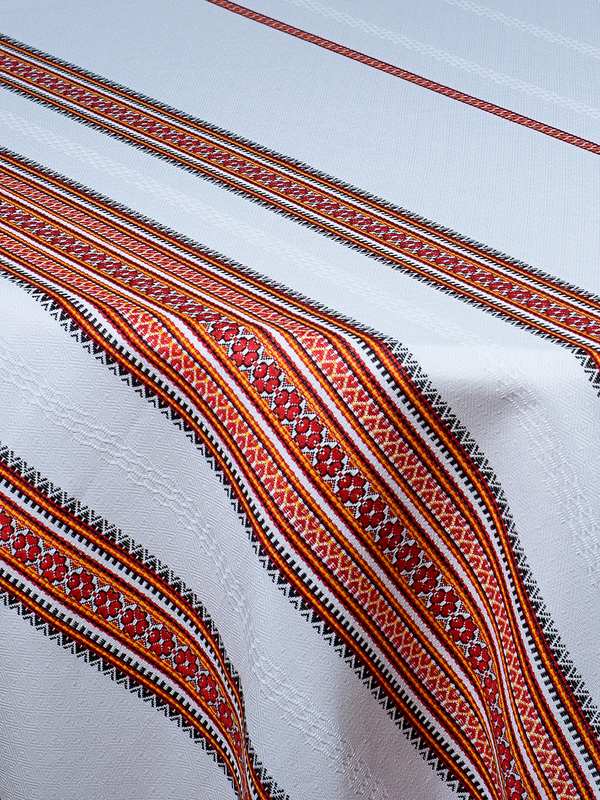 Вишита скатертина Водограй 1. Розмір 145x100 см або 145x225 см. Геометричним візерунок. Стиль традиційний. Вишивка акриловими нитками. Тканина біла. Нитки червоні, чорні та оранжеві.
