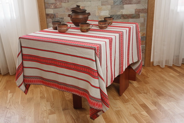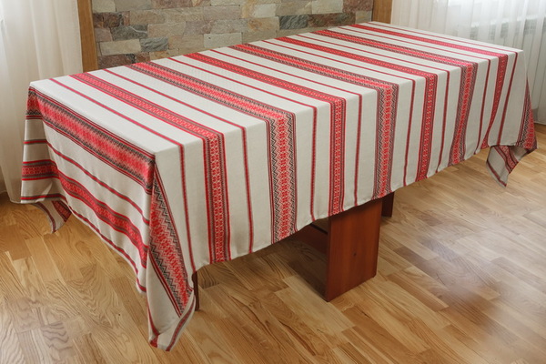 Вишита скатертина. Розмір 145 х 140, 145 х 145, 145 х 155, 145 х 165, 145 х 175, 145 х 180, 145 х 190, 145 х 195, 145 х 215, 145 х 220, 145 х 230, 145 х 235 см. Вишивка червоними, чорними та акриловими нитками в традиційному українському стилі з геометричним візерунком.
