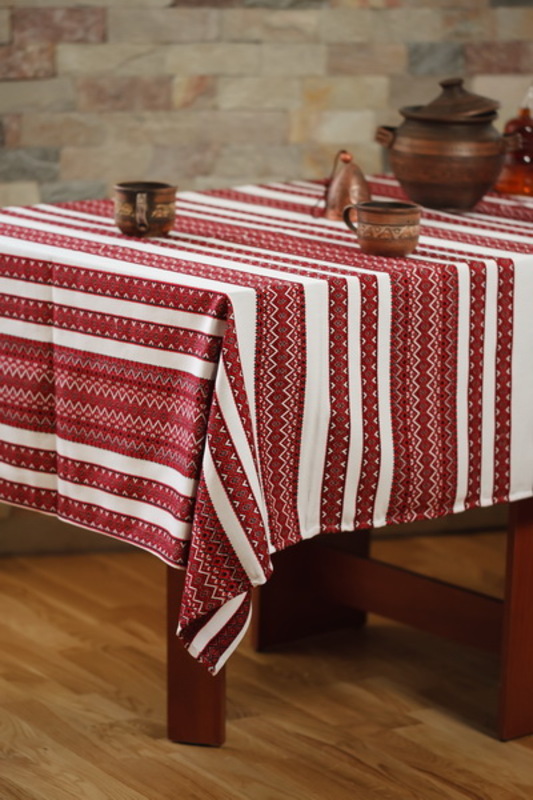 Вишита скатертина B4. Розмір 145 х 110, 145 х 145, 145 х 155, 145 х 165, 145 х 180, 145 х 185, 145 х 220, 145 х 225, 145 х 230 см. Вишивка червоними, чорними та акриловими нитками в традиційному українському стилі з геометричним візерунком.