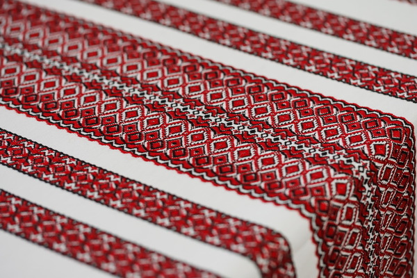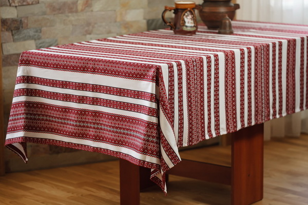 Вишита скатертина B4. Розмір 145 х 110, 145 х 125, 145 х 150, 145 х 160, 145 х 175, 145 х 180, 145 х 185, 145 х 215, 145 х 225, 145 х 230, 145 х 235 см. Вишивка червоними, чорними та акриловими нитками в традиційному українському стилі з геометричним візерунком.