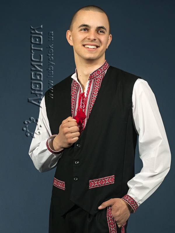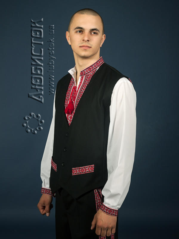 Чоловіча вишита камізелька КМ 9-26. Тканина - чорний габардин. Вишивка жилетки червоно-чорного кольору. Жилетка-вишиванка чудово підійде для святкових подій та творчих виступів, так і як оригінальний одяг.