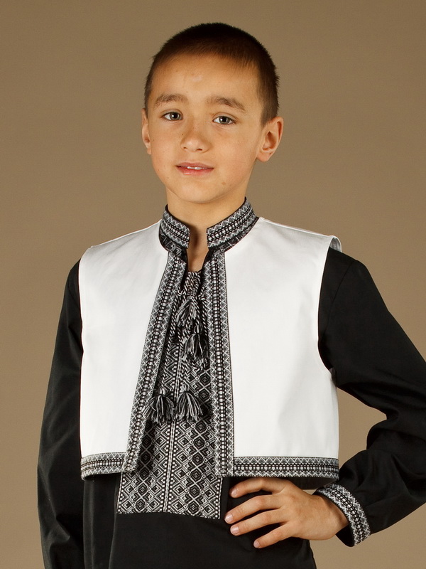 Дитяча вишита камізелька КМ 3-5. Тканина - білий габардин. Вишивка жилетки чорного кольору. Жилетка-вишиванка чудово підійде для святкових подій та творчих виступів.