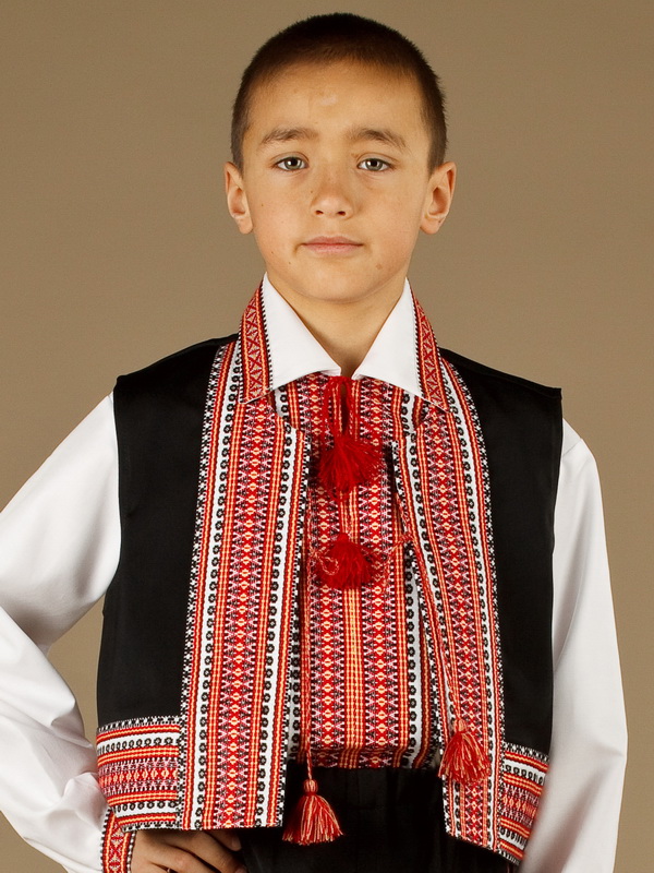 Дитяча вишита камізелька КМ 4-2. Тканина - чорний габардин. Вишивка жилетки червоно-жовто-чорного кольору. Жилетка-вишиванка чудово підійде для святкових подій та творчих виступів.