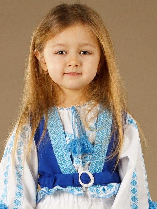 Дитяча вишита камізелька КМ 6-12 для дівчаток. Тканина - синій габардин. Вишивка жилетки блакитного кольору. Жилетка-вишиванка чудово підійде для святкових подій та творчих виступів.