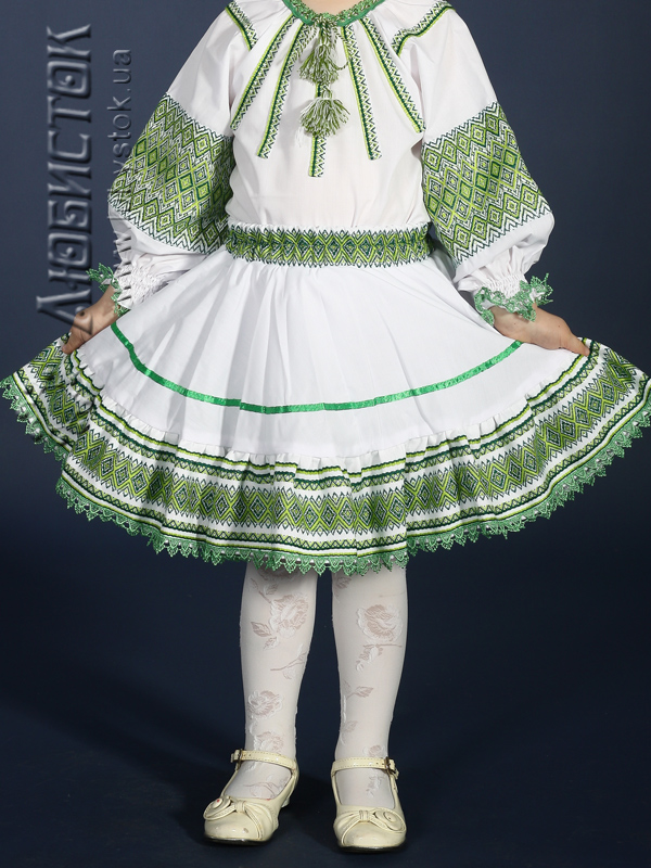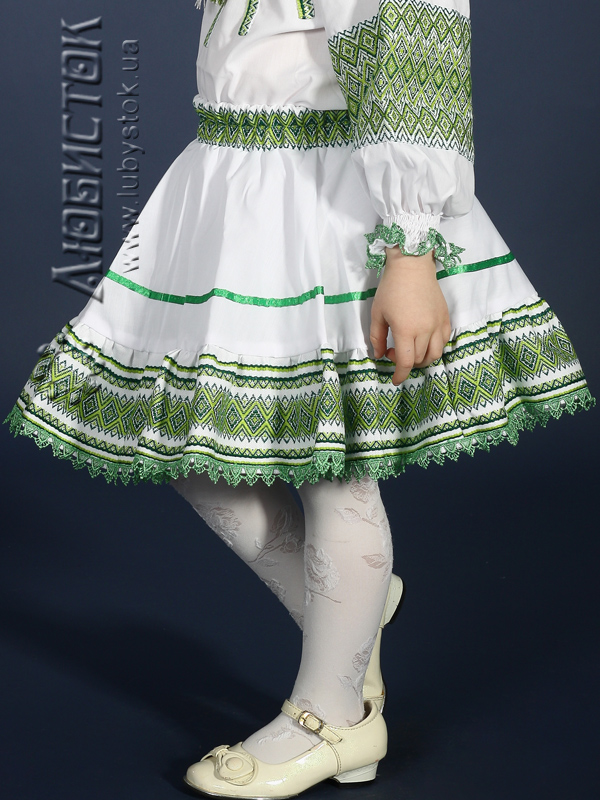 Українська вишита спідниця для дівчинки - модель С1-15. Вишивка ткана, зеленими та білими акриловими нитками. Візерунок 15 - геометричний.