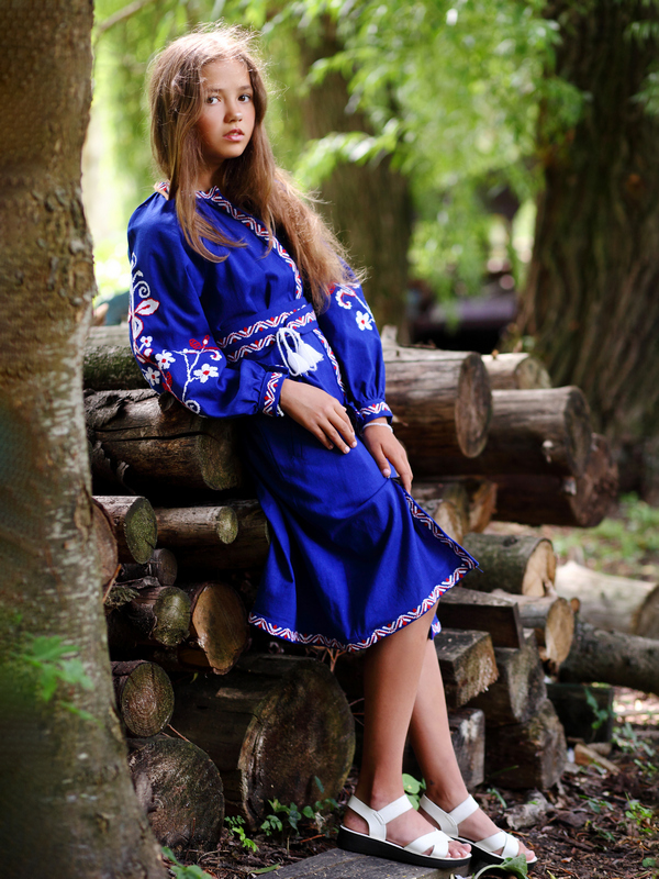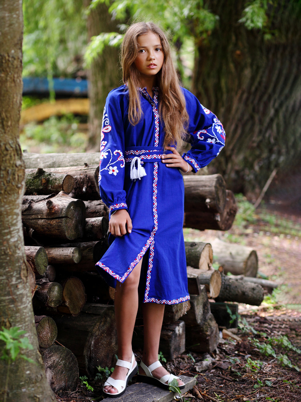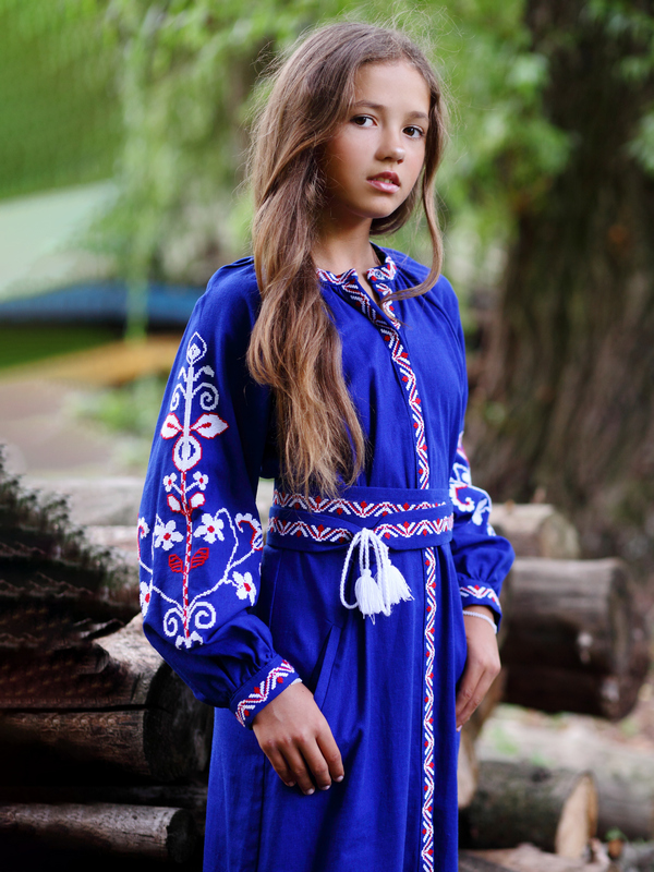 Дитяча сукня - вишите плаття - українська вишиванка модель D-010-01-d. Оригінальна та стильна сукня з поясом. Стиль сучасний з традиційними мотивами на синій тканині з натурального льону. Вишиванка вишита хрестиком червоними та білими акриловими нитками. Вишивка рослинна у вигляді квітів та з гометричним візерунком. Рукав довгий. Чудово підійде як для святкових так і для днів коли хочеться мати оригінальний та стильний вигляд.