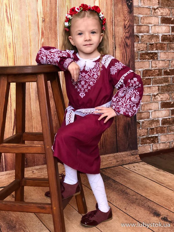 Купити вишите платтячко для дівчинки у інтернет магазині www.lubystok.ua. Вишите платтячко - дитяча сукня D-101-01-d. Оригінальне ніжне платтячко на бордовому натуральному льоні. Вишиванка вишита хрестиком білими акриловими нитками. Вишивка рослинна у вигляді квітів та з гометричним візерунком. Рукав довгий. Гарна сукня для свят, концертів чи виступів на сценічні в школі або дитячому садку.