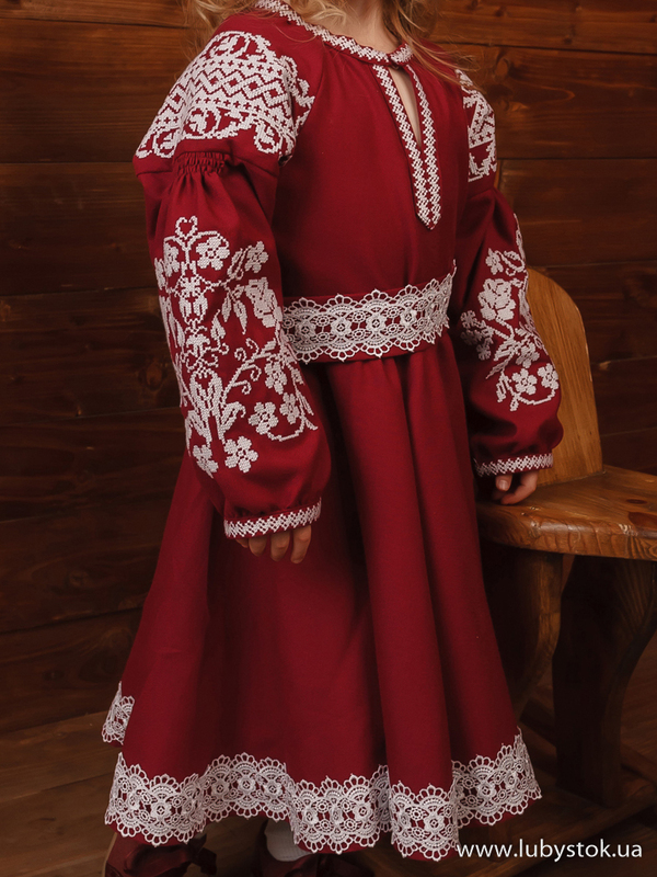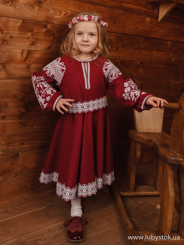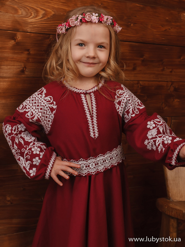 Купити вишите платтячко для дівчинки у інтернет магазині www.lubystok.ua. Вишите платтячко - дитяча сукня D-121-02-d. Оригінальна та стильна сукня з поясом. Оригінальне ніжне платтячко на бордовому натуральному льоні. Вишиванка вишита хрестиком білими акриловими нитками. Вишивка рослинна у вигляді квітів та з гометричним візерунком. Рукав довгий. Гарна сукня для свят, концертів чи виступів на сценічні в школі або дитячому садку.