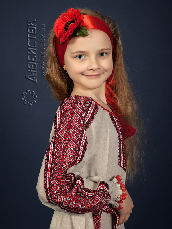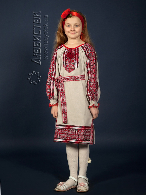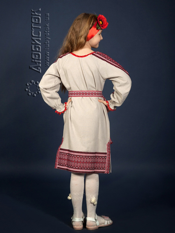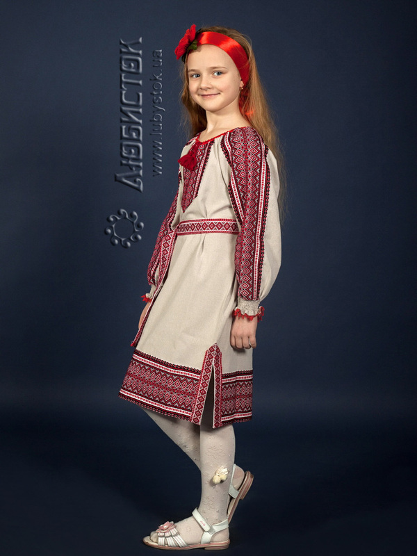 Українське вишите плаття для дівчинки в народному стилі - українська вишиванка - модель ЖП 5-49. Вишивка ткана, червоними, чорними та білими акриловими нитками. Візерунок 49 - геометричний.