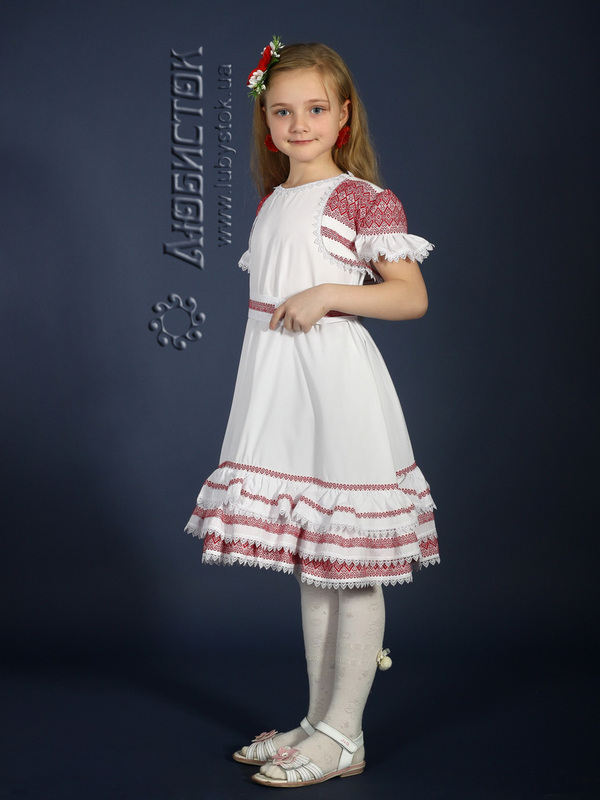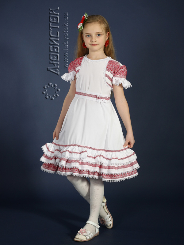 Українське вишите плаття для дівчинки - українська вишиванка - модель ЖП 14-11. У коплект входить сукня та болеро. Вишивка ткана, червоними та білими акриловими нитками. Візерунок 11 - геометричний.