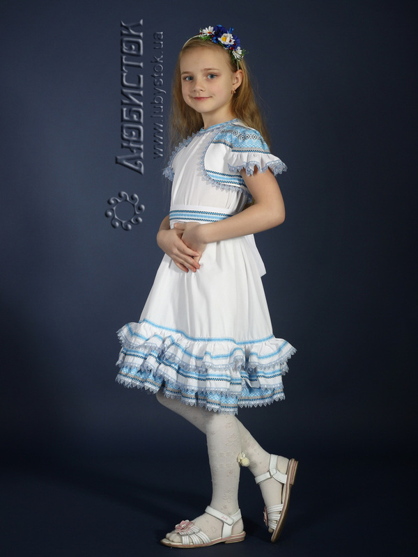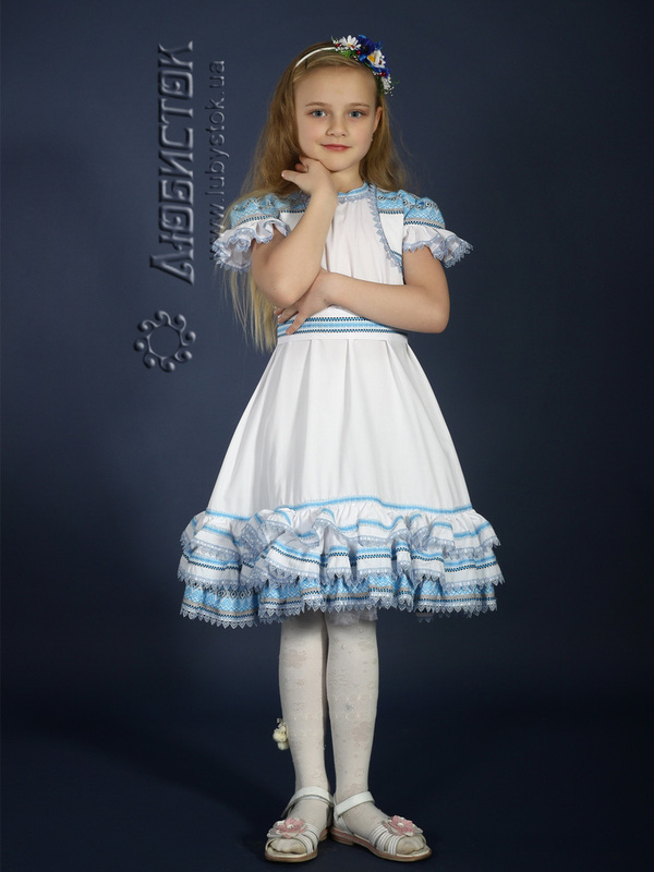 Українське вишите плаття для дівчинки - українська вишиванка - модель ЖП 14-36. У коплект входить сукня та болеро. Вишивка ткана, блакитними акриловими нитками. Візерунок 36 - геометричний.