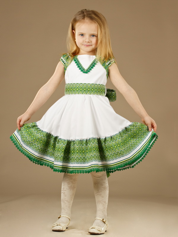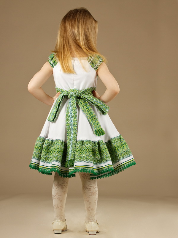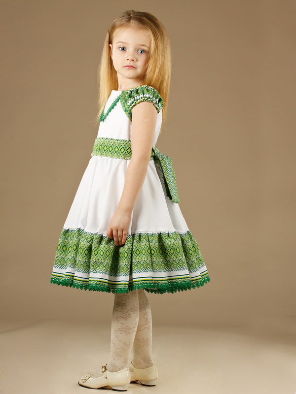 Українське вишите плаття для дівчинки - українська вишиванка - модель ЖП 21-15. Вишивка ткана, зеленими та білими акриловими нитками. Візерунок 15 - геометричний.