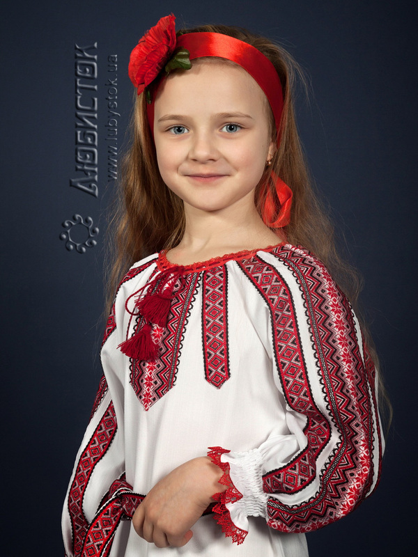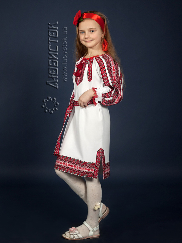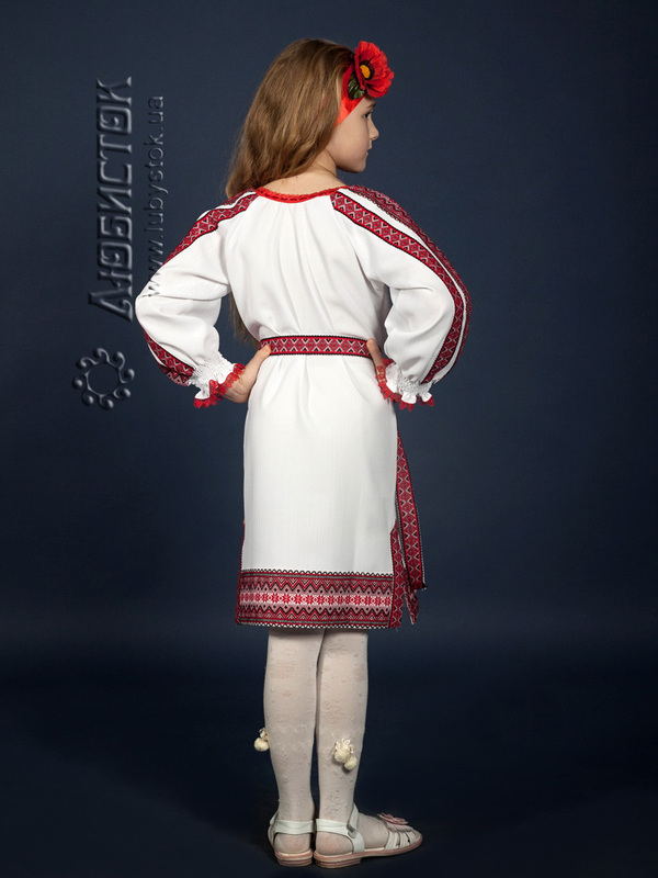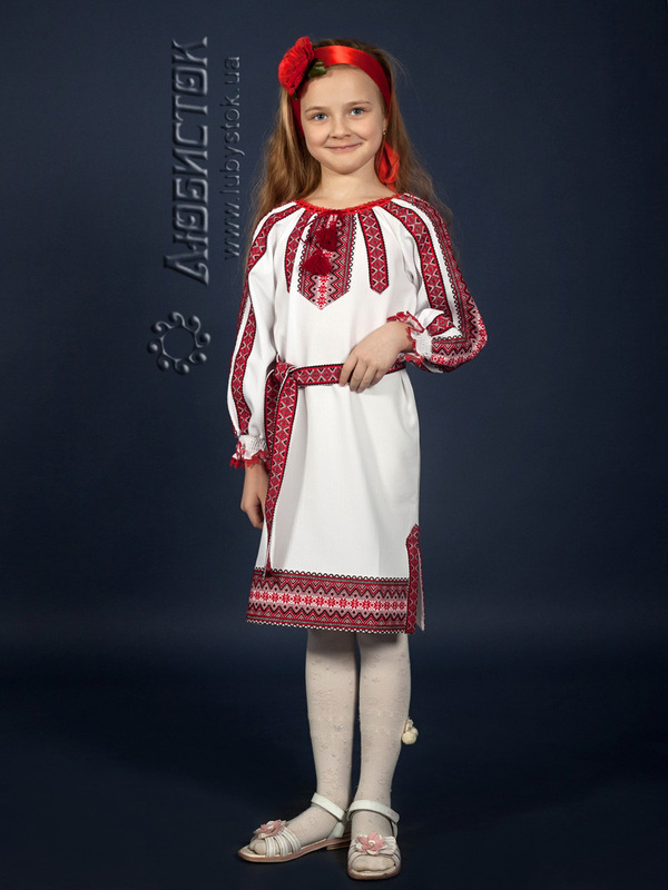 Українське вишите плаття для дівчинки в народному стилі - українська вишиванка - модель ЖП 77-78. Вишивка ткана, червоними, чорними та білими акриловими нитками. Візерунок 78 - геометричний.