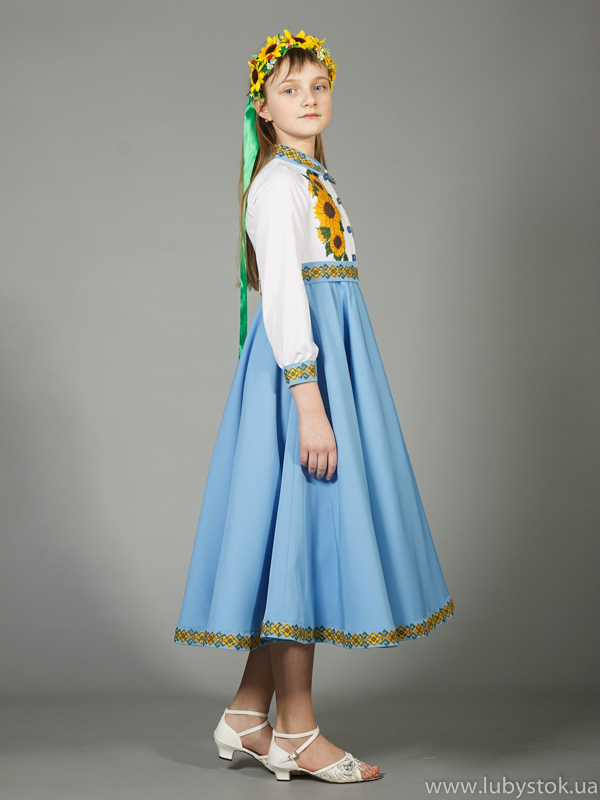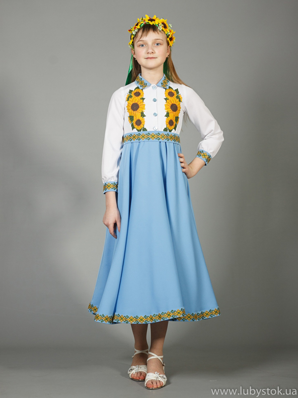 Дитяча сукня - вишите плаття з соняхами - українська вишиванка модель ЖПВ 41-1. Вишукана та оригінальна сукня, завдяки двом кольорам тканини та багатій вишивці має дуже оригінальний вигляд. Тканина тіар білого та блакитного кольору. Вишивка виконана хрестиком - рослиним візерунком у вигляді соняхів, жовтими, коричневими та зеленими акриловими нитками. Рукав три четверті, комір відкидний. Гарно підійде для будь яких свят та подій у житті вашої дитини. Надасть оригінального та святкового вигляду.