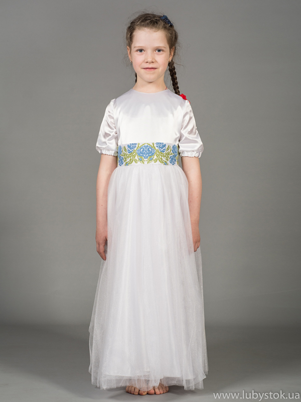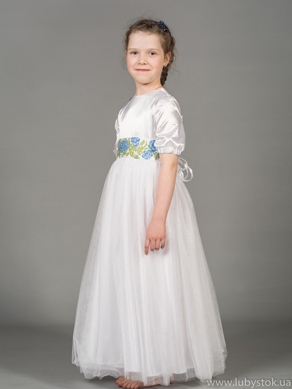 Дитяча сукня - вишите плаття з квітками - українська вишиванка модель ЖПВ 42-1. Гарна святкова сукня - завдяки тканині та лагідній вишивці має ніжний та легкий вигляд. Тканина атлас та шифон. Вишивка виконана хрестиком - рослиним візерунком, блакитними та світло зеленими акриловими нитками. Рукав короткий. Ця сукня чудово підійде для особливих подій у житті вашої дитини. Надасть вишуканого та ніжного вигляду. Може бути чудовим подарунком. Чудове вишите плаття хрестиком у класичних мотивах українського стилю - www.lubystok.ua .