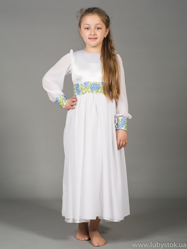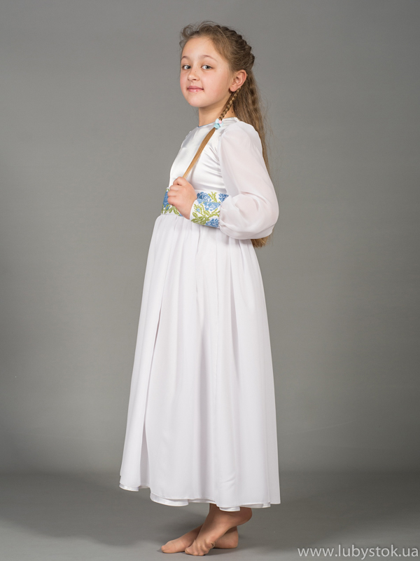 Дитяча сукня - вишите плаття з квітками - українська вишиванка модель ЖПВ 43-1. Гарна святкова сукня - завдяки тканині та лагідній вишивці має ніжний та легкий вигляд. Тканина білого кольору. Вишивка виконана хрестиком - рослиним візерунком, блакитними та світло зеленими акриловими нитками. Рукав довгий, на манжеті вишивка. Ця сукня чудово підійде для особливих подій у житті вашої дитини. Надасть вишуканого та ніжного вигляду. Може бути чудовим подарунком.