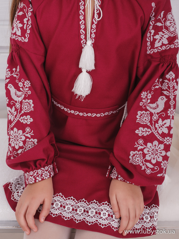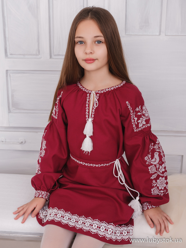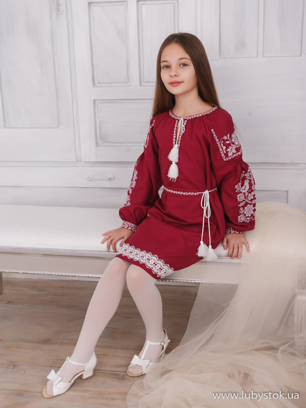 Купити вишите плаття для дівчинки у інтернет магазині www.lubystok.ua. Дитяча сукня - вишите плаття D-069-02-d. Оригінальна та стильна сукня з поясом. Стиль сучасний з традиційними мотивами на бордовій тканині. Вишиванка вишита хрестиком білими акриловими нитками. Вишивка рослинна у вигляді квітів та з гометричним візерунком. Рукав довгий. Чудове святкове дитяче платтячко для нарядного вигляду. Гарний варіант як концертне чи сценічне плаття.