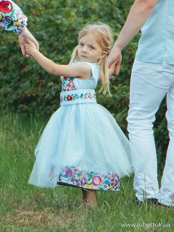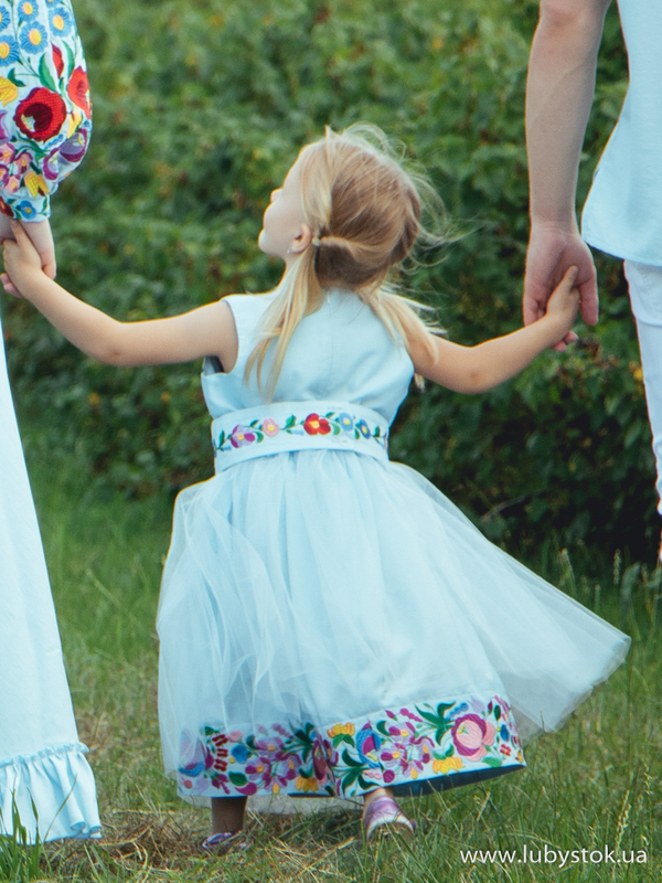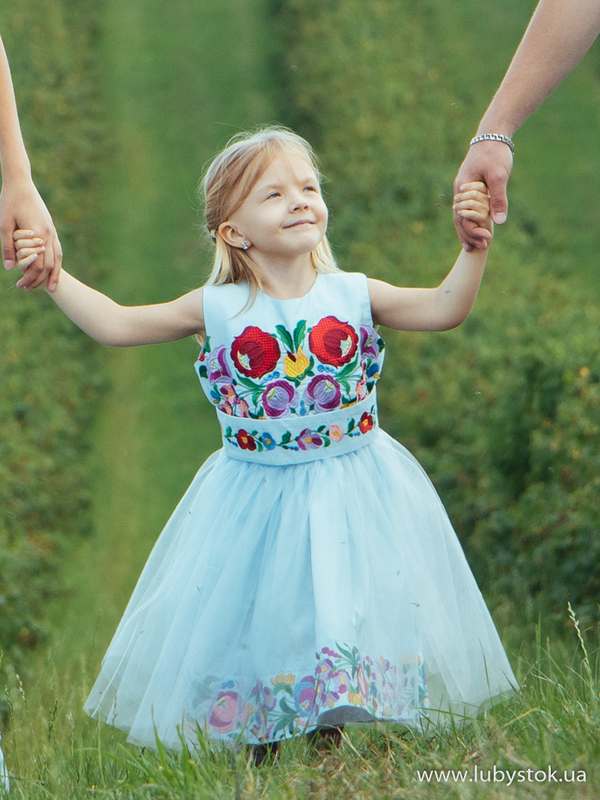 Дитяча сукня - вишите плаття гладдю - українська вишиванка модель D-075-01-d. Оригінальна та стильна сукня для дівчинки. Стиль сучасний з традиційними мотивами на блакитній тканині з натурального льону. Сукня вишита гладдю кольоровими нитками з віскози. Вишивка рослинна у вигляді кольорових квітів. Без рукава.