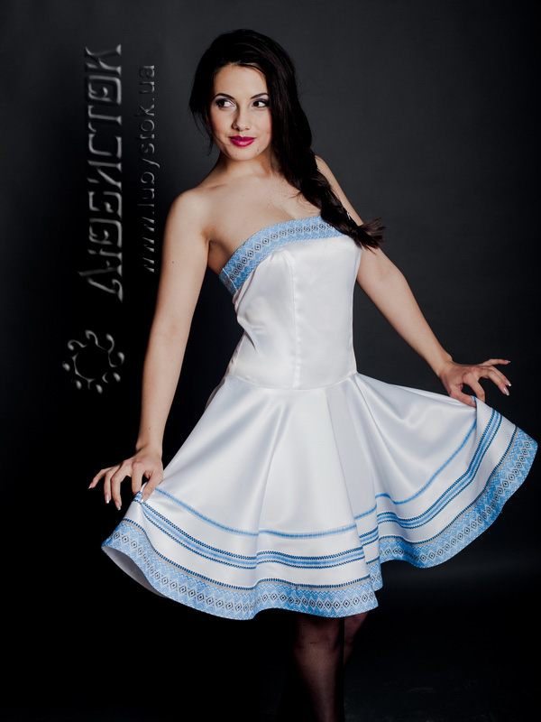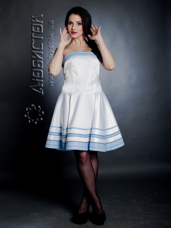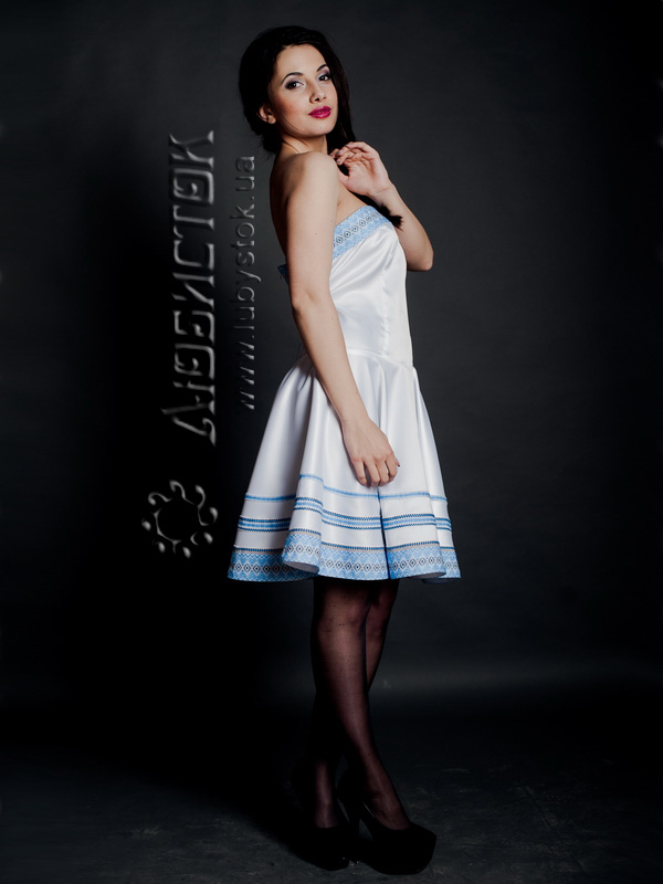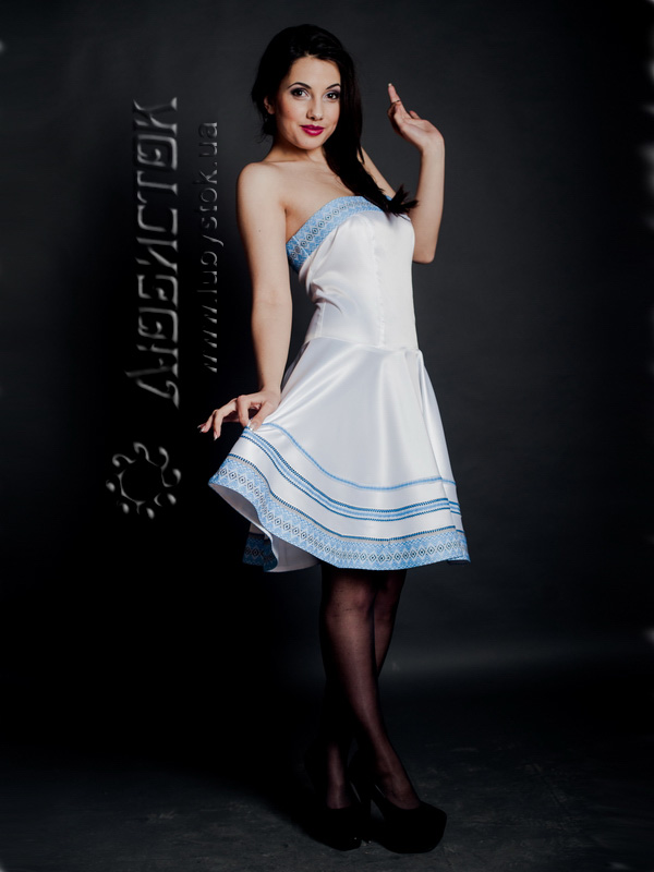 Стильна сукня ЖП 37-36 з білого королівського атласу. Надзвичайно вишуканий молодіжний варіант для святкового виходу з ніжною вишивкою у голубих тонах. Фасон сукні підкреслює витончений жіночий стан у верхній частині за допомогою топу, а нижня частина вільна, що дозволяє відчути себе справжньою принцесою на балу життя. В цій моделі бретелі не передбачені, тому така сукня чудово підійде сміливим, впевненим в собі дівчатам та жінкам. Хочете відчути себе богинею – тоді купуйте і не пожалкуєте!