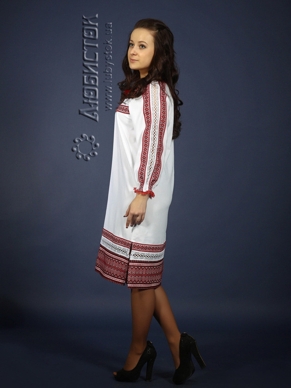 Вишита сукня ЖП 75-49 в традиційному українському стилі. Вільний крій буде доречним для кожної жінки (а особливо, якщо ви бажаєте приховати деякі недоліки вашої фігури). Чудова, колоритна вишивка, яка розстелилась по рукавах, зоні декольте та краю сукні, акцентує увагу на своїй вишуканості. Оригінальності такому вбранню додає мереживо, яке ніжним шлейфом лягло між орнаментом в традиційних червоно-чорних кольорах.