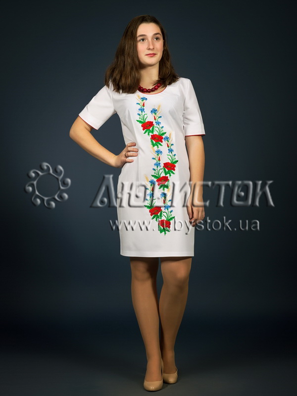 Вишита сукня гладдю ЖПВ 1-1. Завдяки візерунку сукня має оригінальний вигляд. Стиль cукні сучасний з традиційними мотивами на білій тканині тіар. Вишиванка вишита гладдю зеленими, червоними, жовтими та синіми акриловими нитками. Візерунок вишивки рослинний у вигляді маків з листочками, волошок та колосків пшениці. Рукав короткий, оригінальний виріз. Цю сукню можна одягнути як у святкові так і у дні коли хочеться мати особливий вигляд.