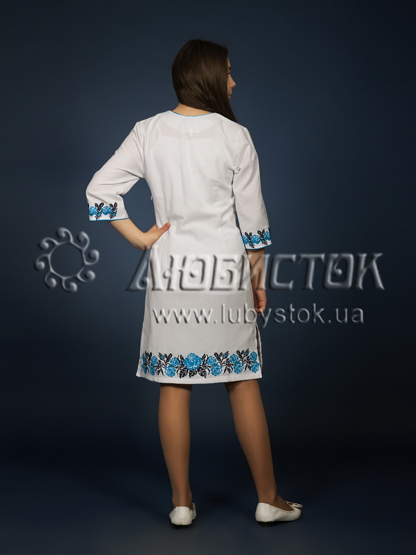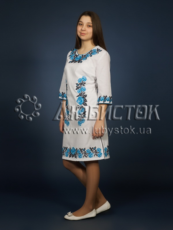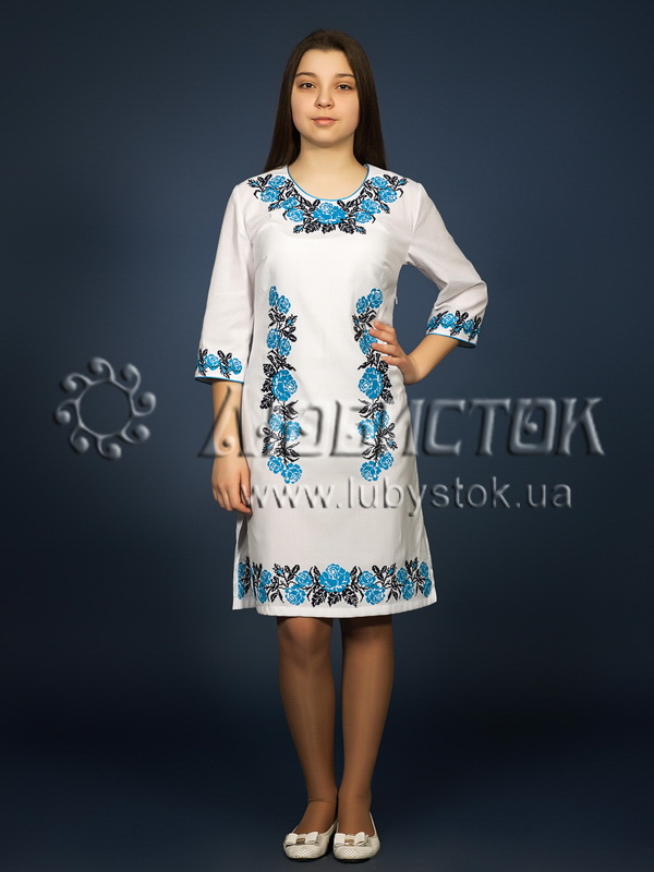 Вишита сукня хрестиком ЖПВ 4-2. Завдяки багатому візерунку має розкішний та елегантний вигляд. Стиль cукні сучасний з традиційними мотивами на білій домотканій тканині. Вишиванка вишита хрестиком синіми та чорними акриловими нитками. Візерунок вишивки рослинний у вигляді троянд з листочками. Рукав три четверті. Ця сукня чудово підійде для святкування особливих свят та для днів коли хочеться мати гарний вигляд.