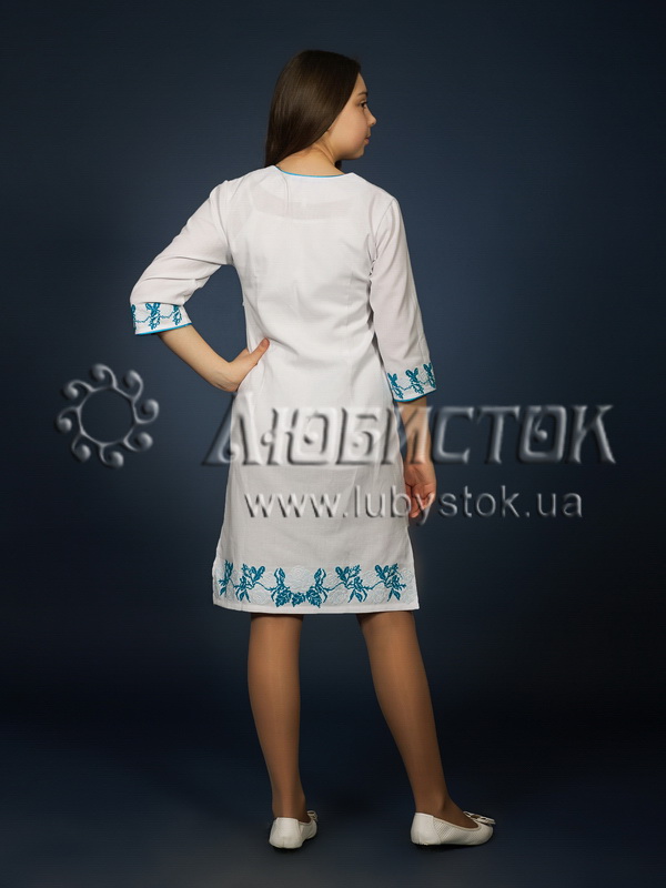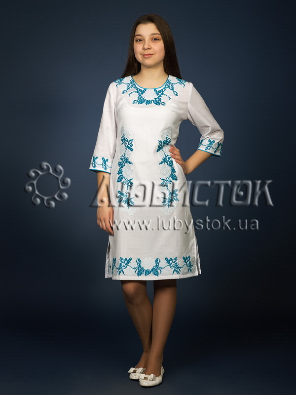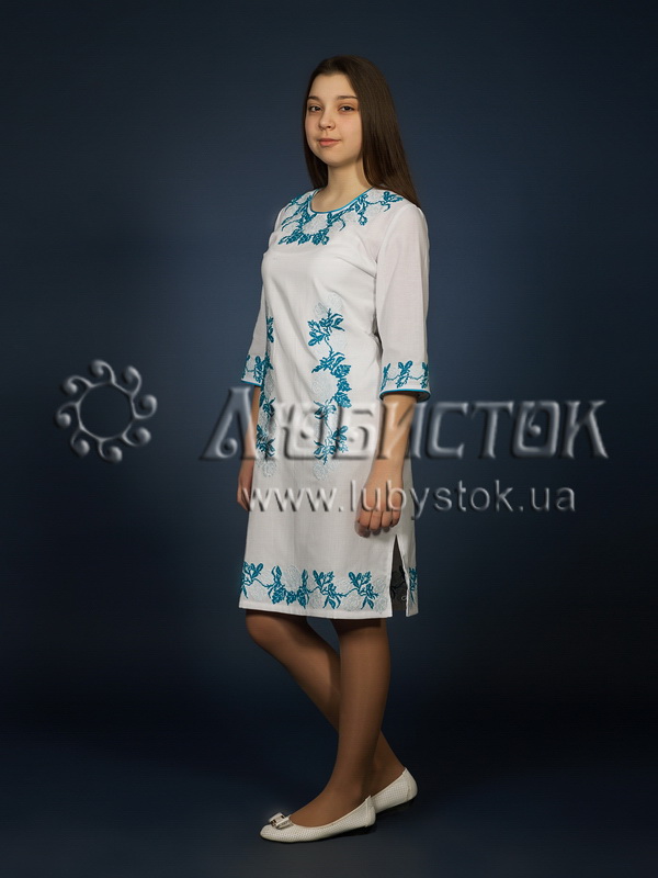 Вишита сукня хрестиком ЖПВ 4-5. Завдяки багатому візерунку має розкішний та елегантний вигляд. Стиль cукні сучасний з традиційними мотивами на білій домотканій тканині. Вишиванка вишита хрестиком білими та блакитними акриловими нитками. Візерунок вишивки рослинний у вигляді троянд з листочками. Рукав три четверті. Ця сукня чудово підійде для святкування особливих свят та для днів коли хочеться мати гарний вигляд.