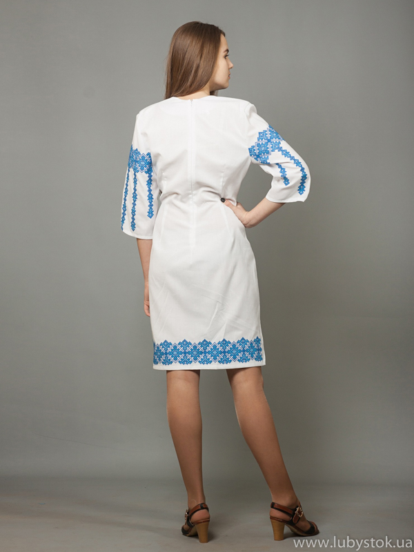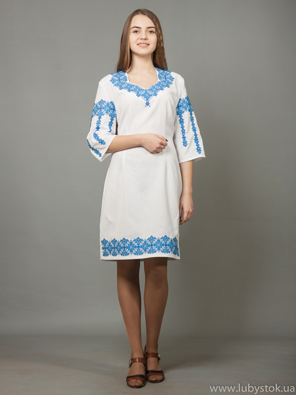 Вишита сукня хрестиком ЖПВ 5-3. Красива сукня - фасон в сучасно-традиційному стилі і саме це робить її оригінальною. Пошита з білої тканини тіар. Вишивка виконана хрестиком блакитними акриловими нитками, геометричним візерунком. Рукав три четверті, оригінальний виріз. Чудово підійде як для святкових так і для будних днів. Надасть вам особливого та оригінального вигляду.