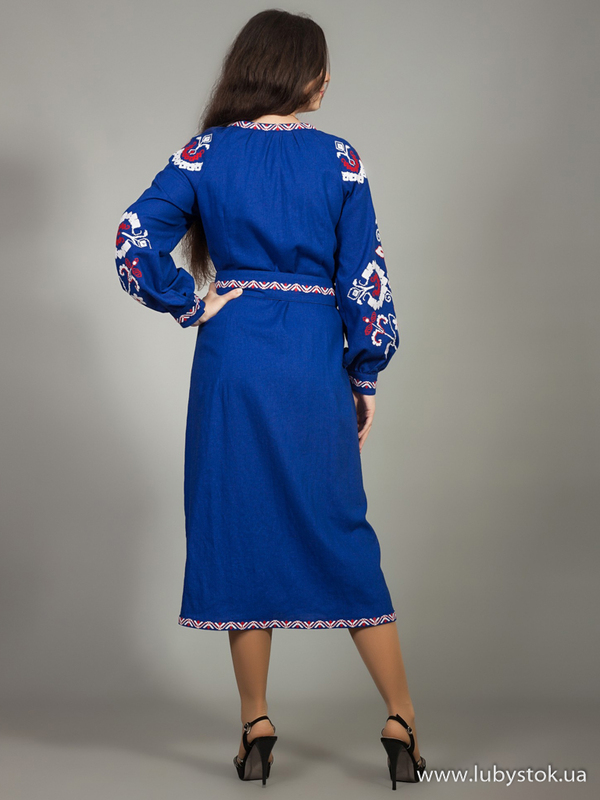 Вишита сукня хрестиком ЖПВ 10-1. Оригінальна, елегантна та стильна сукня з поясом. Стиль сучасний з традиційними мотивами на синій тканині з натурального льону. Вишиванка вишита хрестиком червоними та білими акриловими нитками. Вишивка рослинна у вигляді квітів та з гометричним візерунком. Рукав довгий. Чудово підійде як для святкових та і для днів коли хочеться мати оригінальний та стильний вигляд.