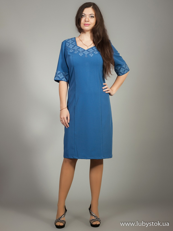 Вишита сукня хрестиком ЖПВ 12-1. Оригінальна cукня у сучасному стилі з традиційними мотивами на синій тканині тіар. Вишиванка вишита хрестиком блакитними акриловими нитками. Вишивка виконана геометричним візерунком. Рукав короткий, оригінальний виріз. Цю сукню можна одягнути як у святкові так і у будні дні. Надасть вам особливого вигляду.