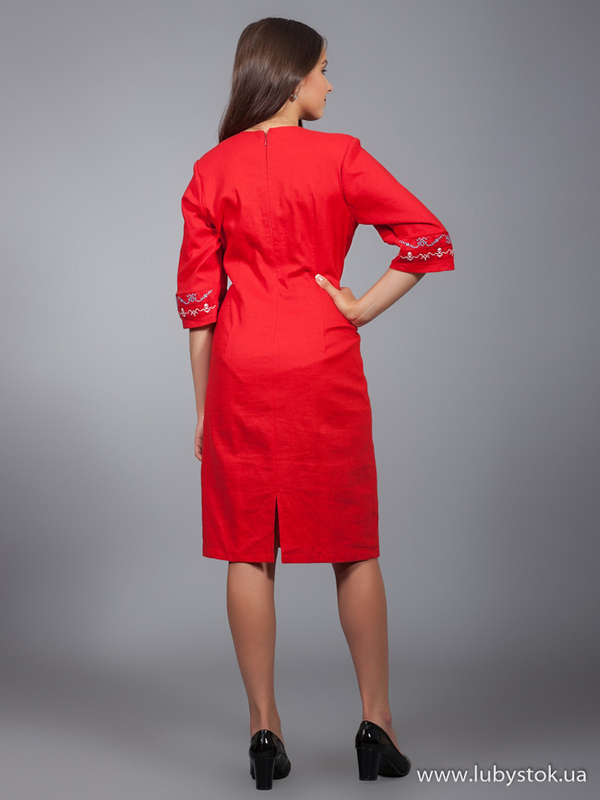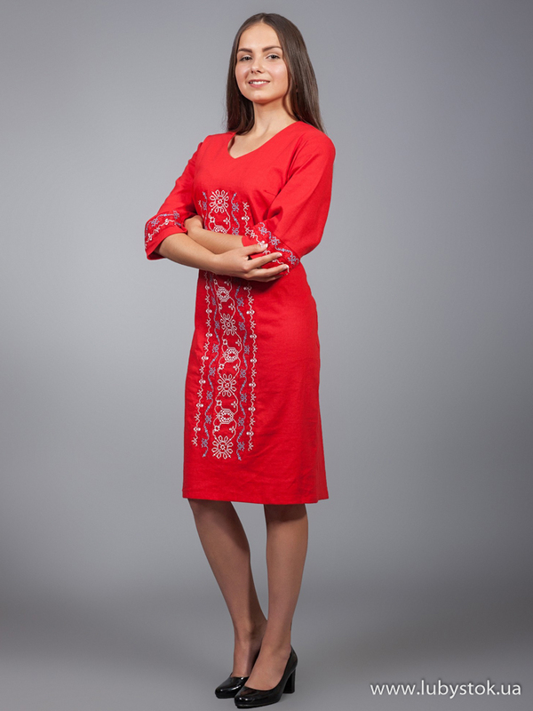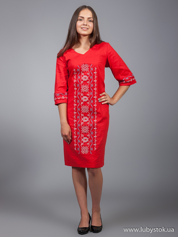 Вишита сукня хрестиком ЖПВ 15-1. Сучасна cукня з традиційними мотивами на червоній тканині з натурального льону. Вишиванка вишита хрестиком білими акриловими нитками. Вишивка виконана геометричним візерунком. Рукав три четверті. Цю сукню можна одягнути як у святкові так і у будні дні. Чудово підійде в день коли хочеться виглядати по особливому.