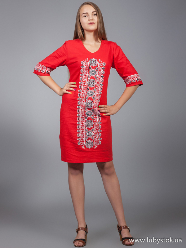 Вишита сукня хрестиком ЖПВ 15-2. Сучасна, оригінальна cукня з традиційними мотивами на червоній тканині з натурального льону. Вишиванка вишита хрестиком білими та сірими акриловими нитками. Вишивка виконана геометричним візерунком. Рукав три четверті. Цю сукню можна одягнути як для особилвої події так і для прогулянки в будь який день.