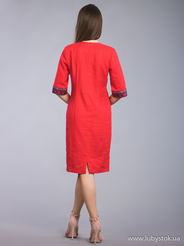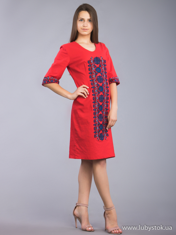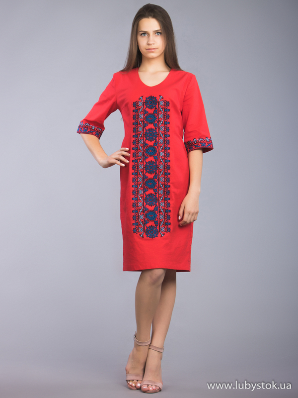 Вишита сукня хрестиком ЖПВ 15-5. Оригінальна cукня у сучасному стилі з традиційними мотивами на червоній тканині з натурального льону. Вишиванка вишита хрестиком синіми акриловими нитками. Вишивка виконана геометричним візерунком. Рукав три четверті, особливий виріз. Чудово підійде як для святкових так і для будних днів.