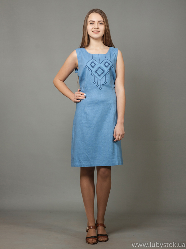 Вишита сукня хрестиком ЖПВ 17-10. Гарна, літня сукня, завдяки кольору має яскравий та особливий вигляд. Стиль сучасний з традиційними мотивами на блакитній тканині з натурального льону. Вишиванка вишита хрестиком синій акриловими нитками, геометричним візерунком. Ця сукня чудово підійде як для особливих подій так і для прогулянок. Надасть вам яскравого та стильного вигляду.