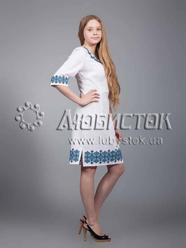 Вишита сукня хрестиком ЖПВ 22-2. Святкова та гарна сукня. Стиль сучасно-традиційний і саме це робить її оригінальною. Пошита з білої тканини тіар. Вишивка виконана хрестиком синіми акриловими нитками, геометричним візерунком. Рукав короткий, оригінальний виріз. Чудово підійде як для святкових так і для будних днів.