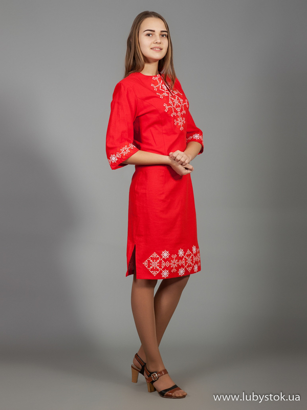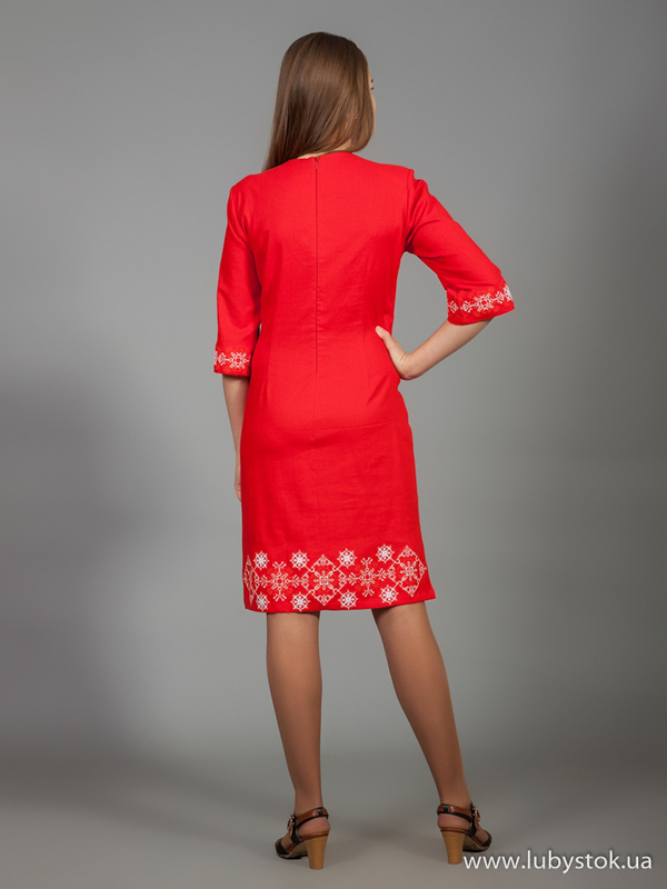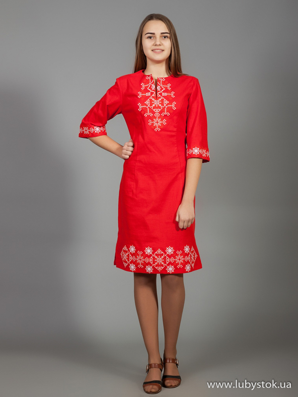 Вишита сукня хрестиком ЖПВ 26-4. Оригінальна cукня у сучасному стилі з традиційними мотивами на червоній тканині з натурального льону. Вишиванка вишита хрестиком білими акриловими нитками. Вишивка виконана геометричним візерунком. Рукав три четверті. Цю сукню можна одягнути як у святкові так і у будні дні. В ній ви будете особливою.