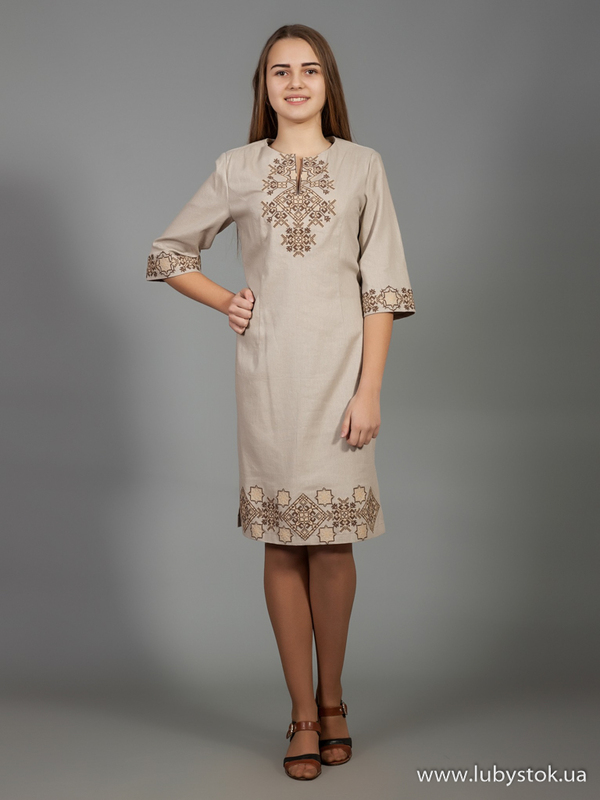 Вишита сукня хрестиком ЖПВ 26-5. Сучасна cукня з традиційними мотивами на бежевій тканині з натурального льону. Вишиванка вишита хрестиком коричневими акриловими нитками. Вишивка виконана геометричним візерунком. Рукав три четверті. Цю сукню можна одягнути як у святкові так і у будні дні. Чудово підійде в день коли хочеться виглядати по особливому.