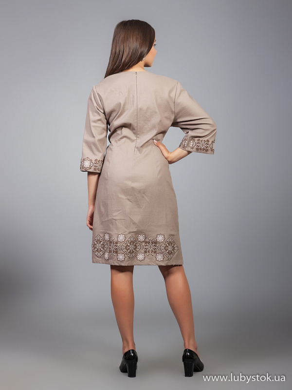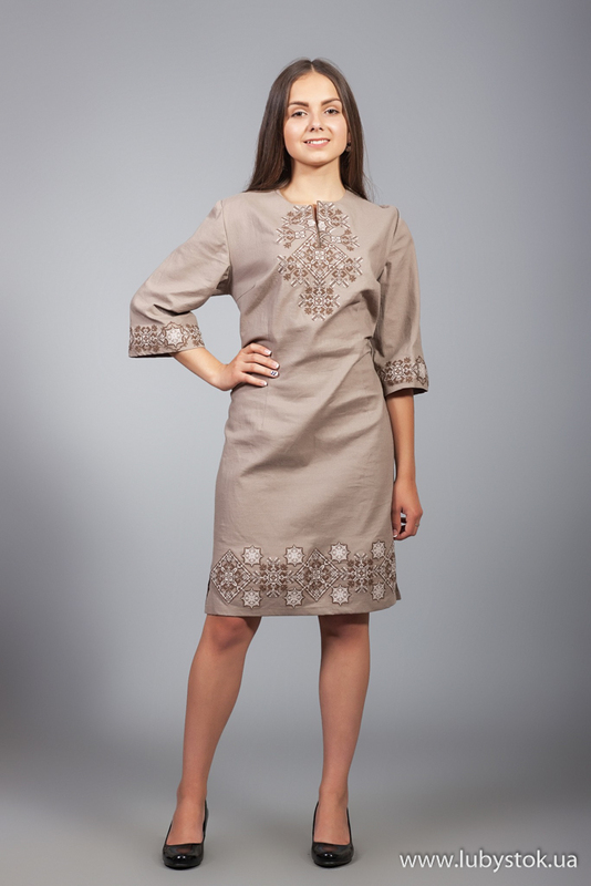 Вишита сукня хрестиком ЖПВ 26-7. Сучасна cукня з традиційними мотивами на тканині з натурального льону кольору кава з молоком. Вишиванка вишита хрестиком коричневими та бежевими акриловими нитками. Вишивка виконана геометричним візерунком. Рукав три четверті. Цю сукню можна одягнути як у святкові так і у будні дні. Чудово підійде в день коли хочеться виглядати по особливому.