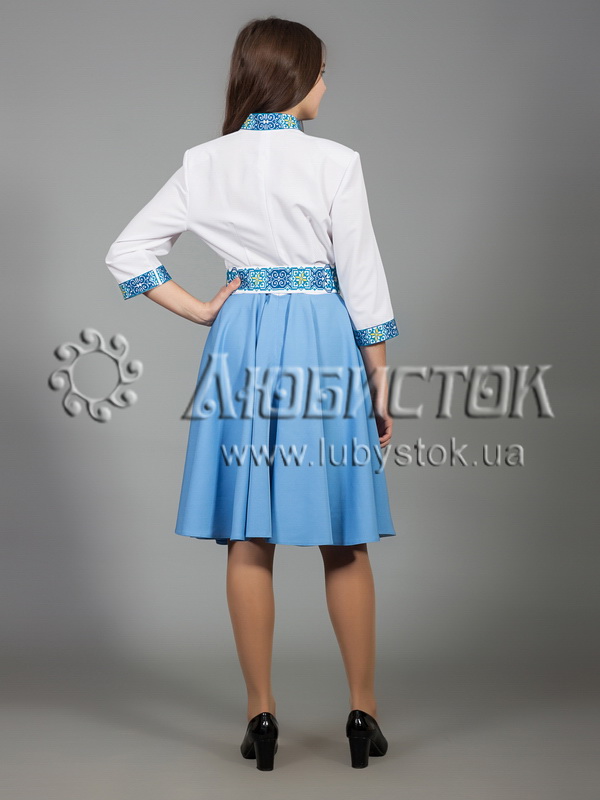 Вишита сукня хрестиком ЖПВ 29-1.Завдяки поєднанню двох кольорів та багатому візерунку ця сукня має оригільний та в одночас класичний вигляд . Стиль сучасний з традиційними мотивами на білій та блакитній тканині тіар. Вишиванка виконана хрестиком блакитними, синіми та бежевими акриловими нитками, геометричним візеруноком. Рукав три четверті. Цю сукню можна одягнути на урочисті події та особливі свята. Вона надасть вам класичного і оригінального вигляду.