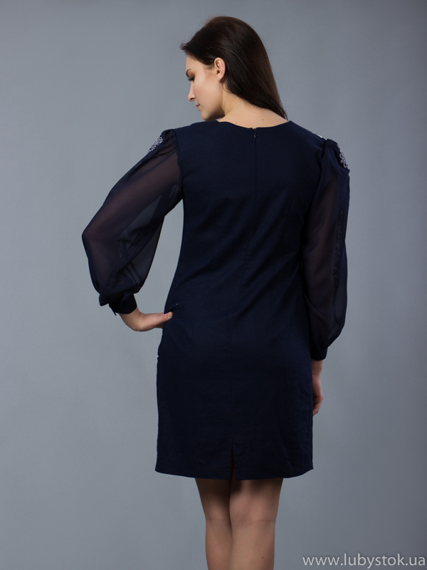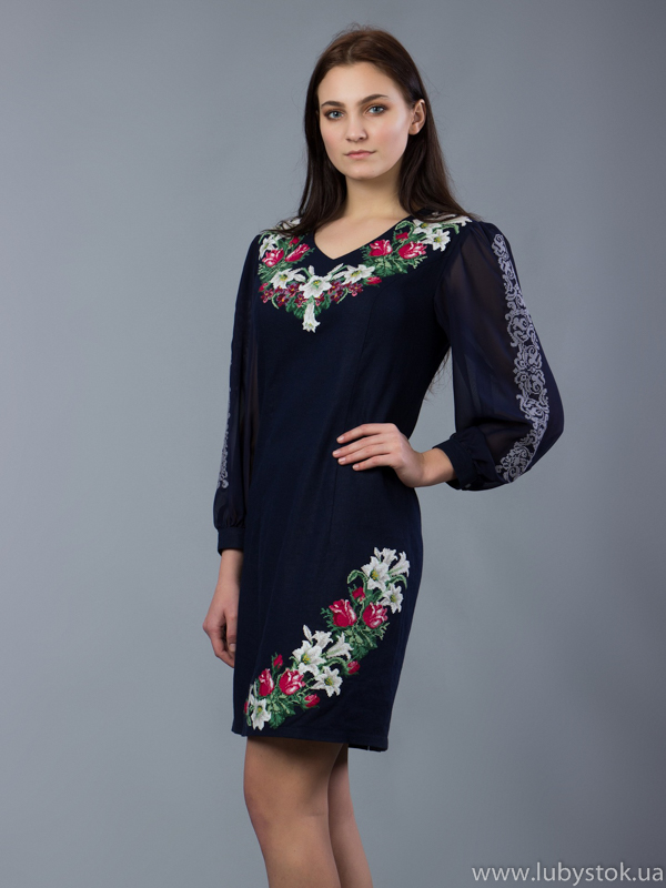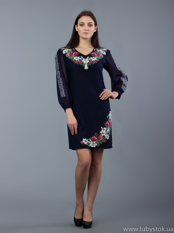 Вишита сукня хрестиком ЖПВ 44-1. Надзвичайно гарна, святкова сукня. Багатий візерунок, та ніжні кольри на вишивці надають цьому платтю особливого вигляду. Стиль сукні сучасний на темно синій тканині з натурального льону. Вишита хрестиком зеленими, рожевими, червоними, бордовими та білими акриловими нитками. Візерунок вишивки рослинний, у вигляді лілій та бутонів троянд. Вишивка розміщена на грудях, рукавах та спідниці. Рукав довгий, виконаний з шифону. Ця сукня чудово підійде для святкування особливих та урочистих подій у вашому житті. Надасть вам вишуканого та особливого вигляду.