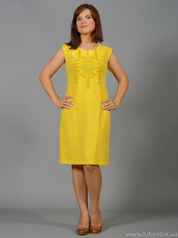 Вишита сукня хрестиком ЖПВ 45-2. Літня сукня, має особливий і завдяки кольору яскравий вигляд. Стиль cукні сучасний з традиційними мотивами на тканині з натурального льону жовтого. Вишиванка вишита хрестиком жовтими та світло блакитними акриловими нитками, у вигляді геометричного візерунку. Можна одягнути літнього дня на будь-які святкові події та просто для приємної прогулянки в будний день. Надасть вам особливого та яскравого вигляду.