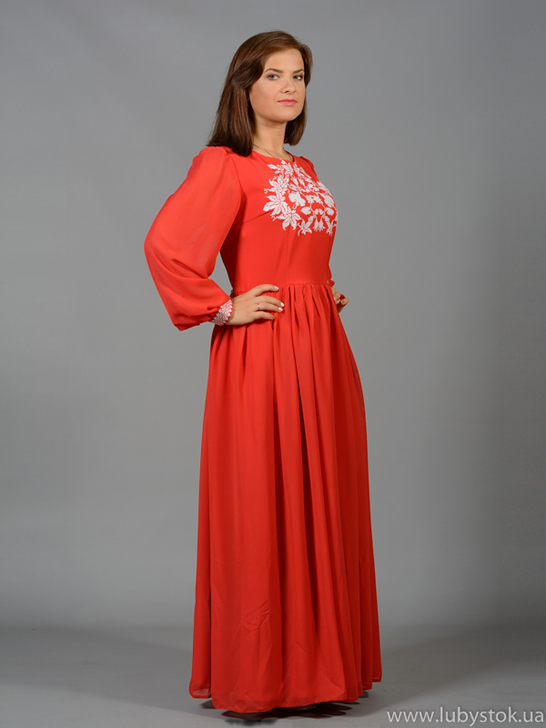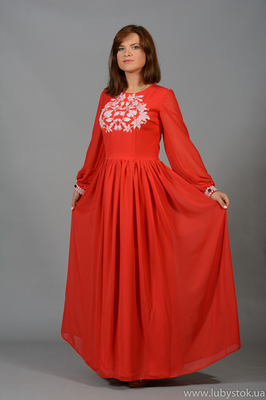 Вишита сукня хрестиком ЖПВ 47-1. Надзвичайно красива та вишукана сукня. Фасон та колір надасть вам яскравогр та особливого вигляду. Тканина шифон надає цьому платті легкості. Стиль сучасний - пошито з ткатини тіар та шифон червоного кольору. Вишивка виконана хрестиком білими акриловими нитками, рослинним візерунком. Рукав довгий. Чудово підійде для особливих та урочистих подій у вашому житті. В цій сукні ви виглядатимете неперевершено.