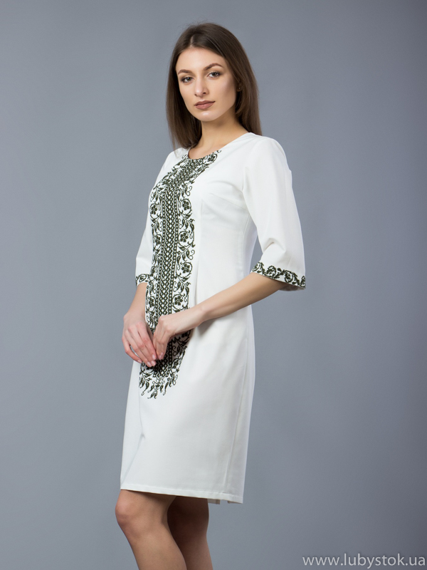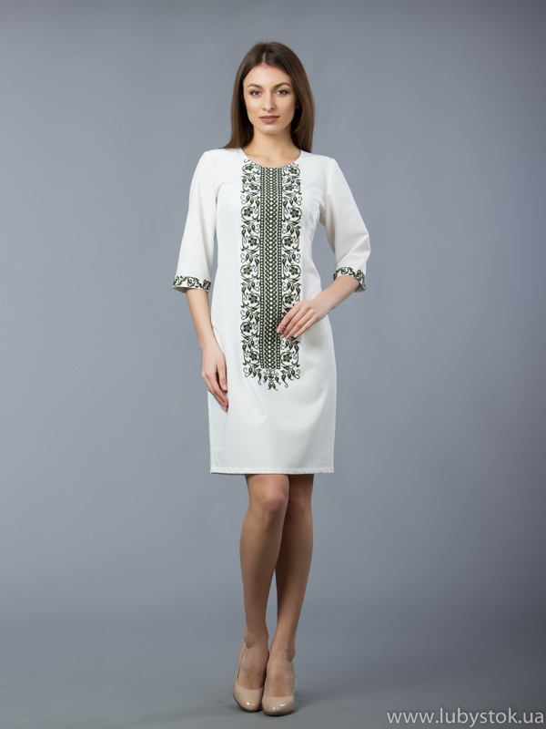 Вишита сукня хрестиком ЖПВ 48-1. Фасон цієї сукні класичний і строгий та завдяки красивій вишивці має ніжний вигляд. Стиль сучасний на тканині тіар білого кольору. Вишита хрестиком темно-зеленими акриловими нитками. Візерунок вишивки - рослинно-геометричний. Рукав - три четверті. Чудово підійде для святкових та урочистих подій. Одягнувши цю сукню ви зможете підкреслити свій смак та красу.