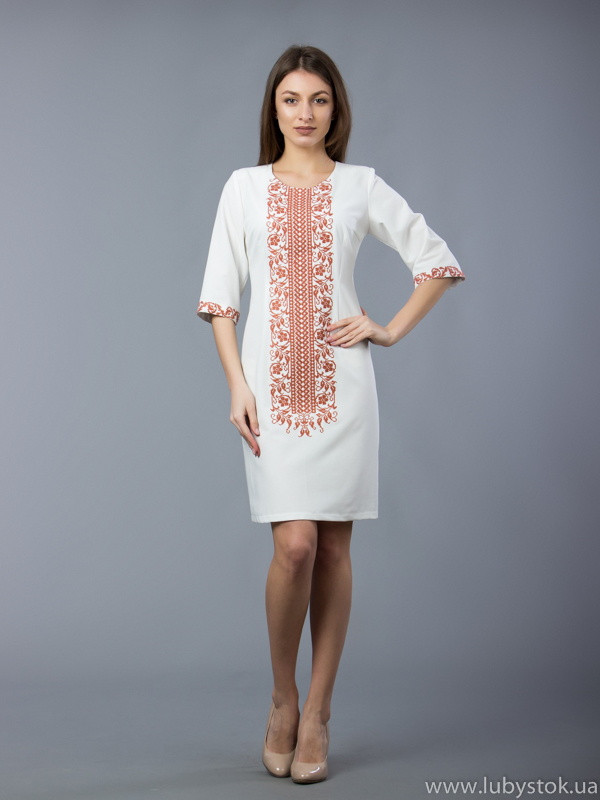 Фасон цієї сукні класичний і строгий та завдяки красивій вишивці має ніжний вигляд. Стиль сучасний на тканині тіар білого кольору. Вишита хрестиком червоними акриловими нитками. Візерунок вишивки - рослинно-геометричний. Рукав - три четверті. Чудово підійде для святкових та урочистих подій. Одягнувши цю сукню ви зможете підкреслити свій смак та красу.