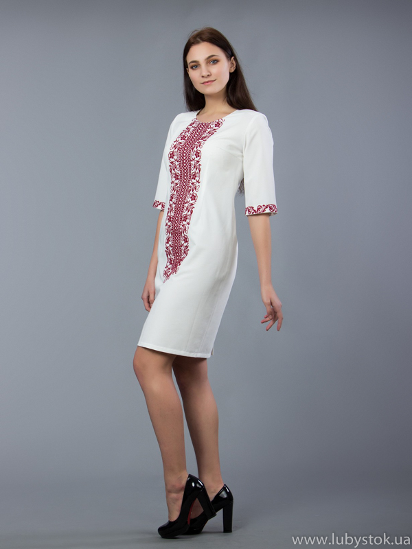 Вишита сукня хрестиком ЖПВ 48-5. Фасон цієї сукні класичний і строгий та завдяки красивій вишивці має ніжний вигляд. Стиль сучасний на тканині тіар білого кольору. Вишита хрестиком червоними акриловими нитками. Візерунок вишивки - рослинно-геометричний. Рукав - три четверті. Чудово підійде для святкових та урочистих подій. Одягнувши цю сукню ви зможете підкреслити свій смак та красу.