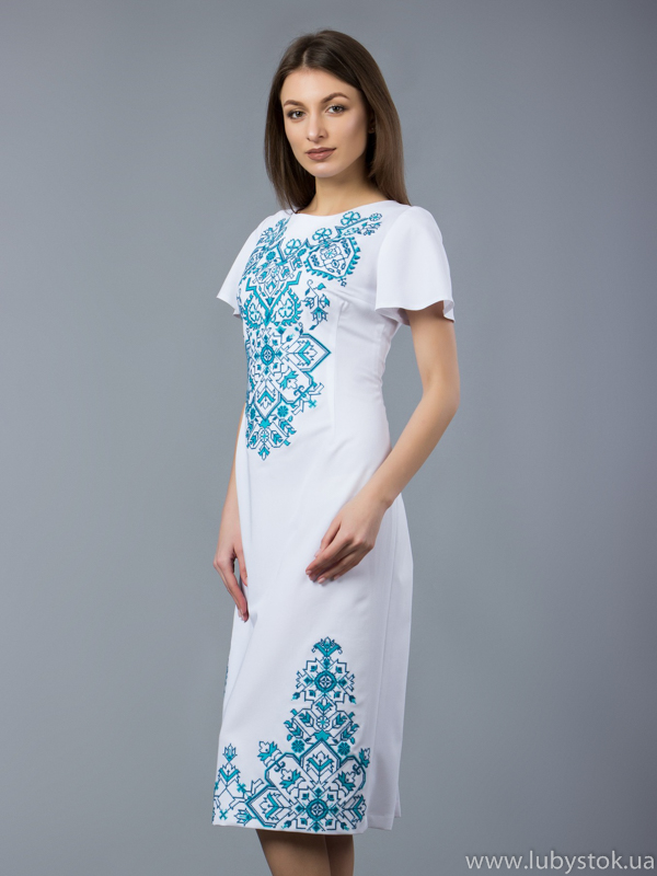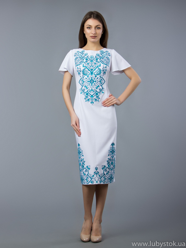 Вишита сукня хрестиком ЖПВ 56-1. Оригінальна, нарядна сукня - завдяки фасону та багатій вишивці має особливий та вишуканий вигляд. Стиль сукні - сучасний на тканині тіар білого кольору. Вишита хрестиком, блакитними акриловими нитками. Візерунок вишивки -геометричний. Ця сукня чудово підійде для святкових та урочистих подій. Надасть вам стильного та вишуканого вигляду. Чудове вишите плаття хрестиком у класичних мотивах українського стилю - www.lubystok.ua .