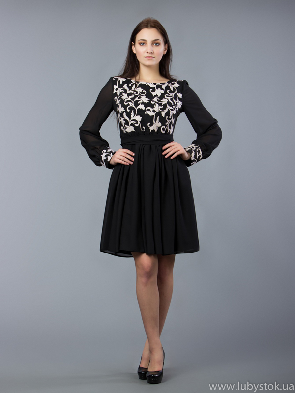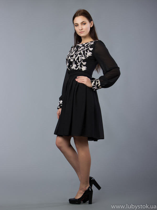 Вишита сукня хрестиком ЖПВ 57-1. Святкова, нарядна сукня - завдяки фасону та багатій вишивці має особливий та вишуканий вигляд. Стиль сукні - сучасний на тканині тіар чорного кольору. Вишита хрестиком, білими акриловими нитками. Візерунок вишивки -рослинний. Ця сукня чудово підійде для святкових та урочистих подій. Надасть вам стильного та вишуканого вигляду.