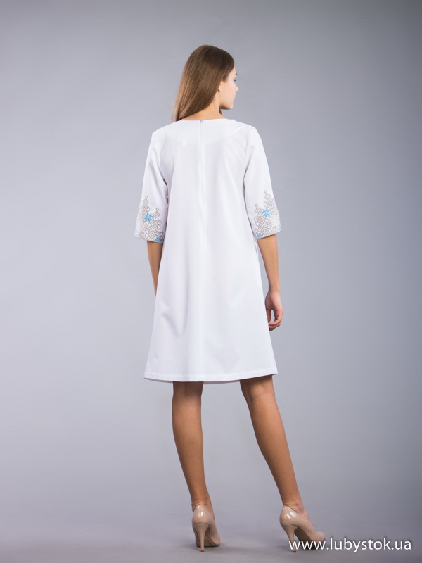 Вишита сукня хрестиком ЖПВ 62-1. Гарна, нарядна сукня. Фасон класичний, оригінальна вишивка надає особливого вигляду. Стиль - сучасний на тканині тіар білого кольору. Вишита хрестиком, сірими, блакитними та чорними акриловими нитками. Візерунок вишивки - геометричний. Рукав - три четверті. Ця сукня чудово підійде як для святкових так і для днів коли хочеться виглядати по особливому.