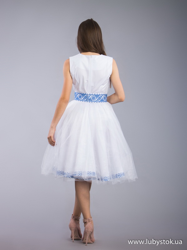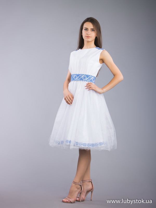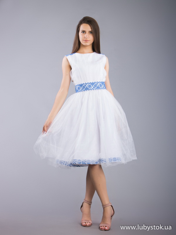 Вишита сукня хрестиком ЖПВ 67-1. Завдяки довжині ця сукня має легкий, елегантий та нарядний вигляд. Стиль cукні сучасний з традиційними мотивами на білій тканині тіар з фатіном. Вишиванка вишита хрестиком синіми акриловими нитками, виконана геометричним візерунком. Без рукава. Завдяки традиційному візерунку ця сукня підійде як для святкування урочистих подій так і для національних свят.